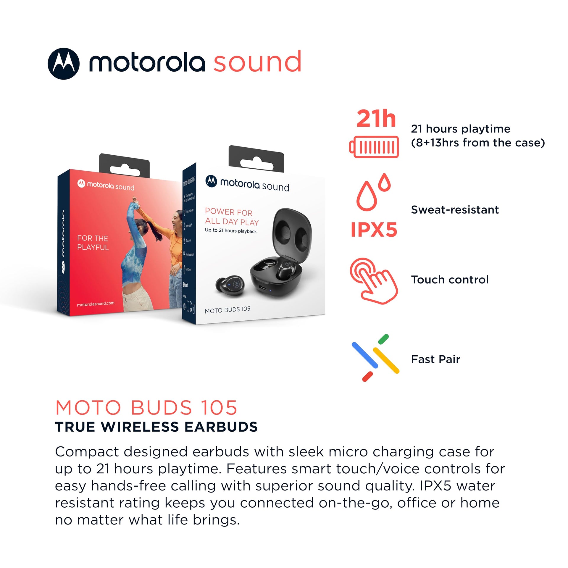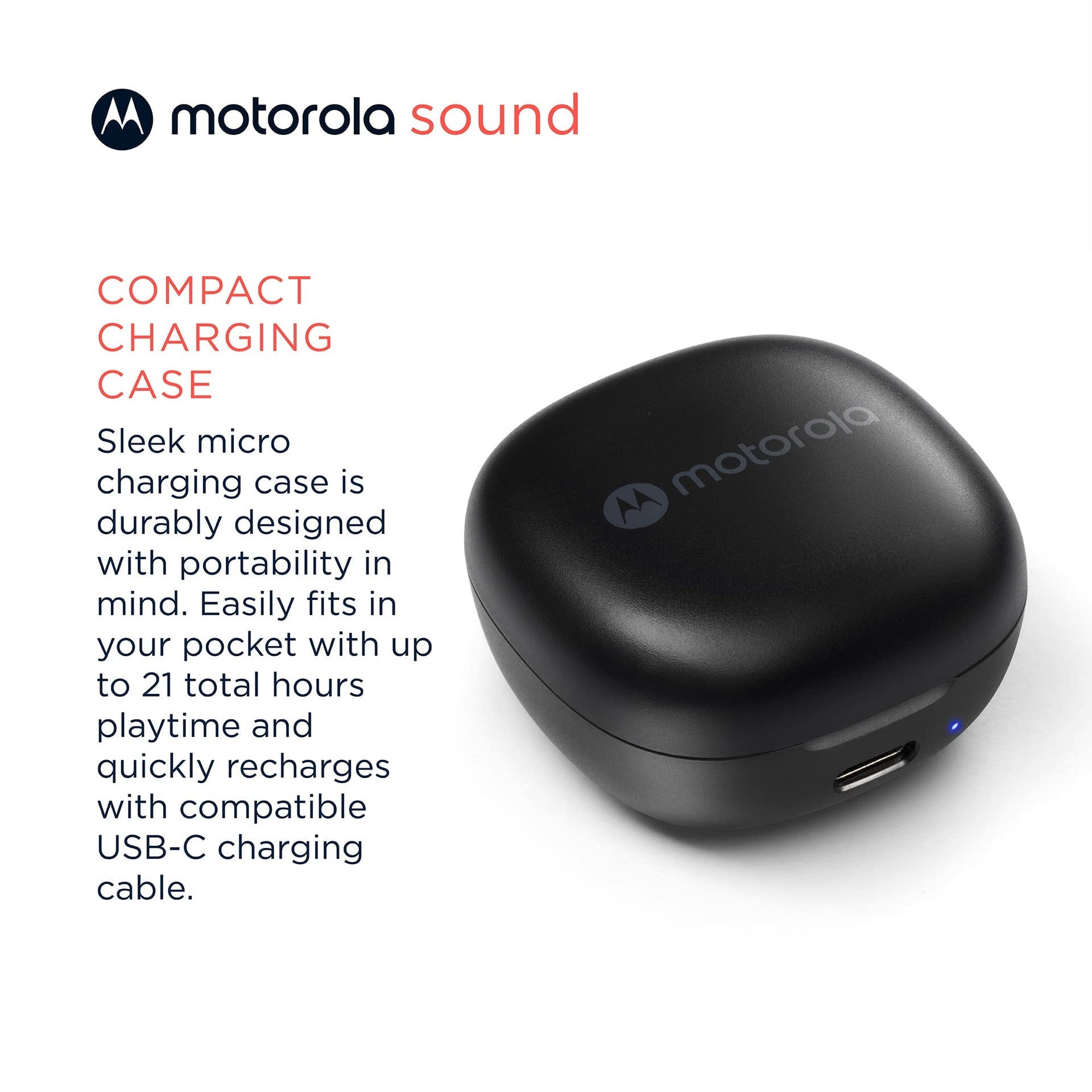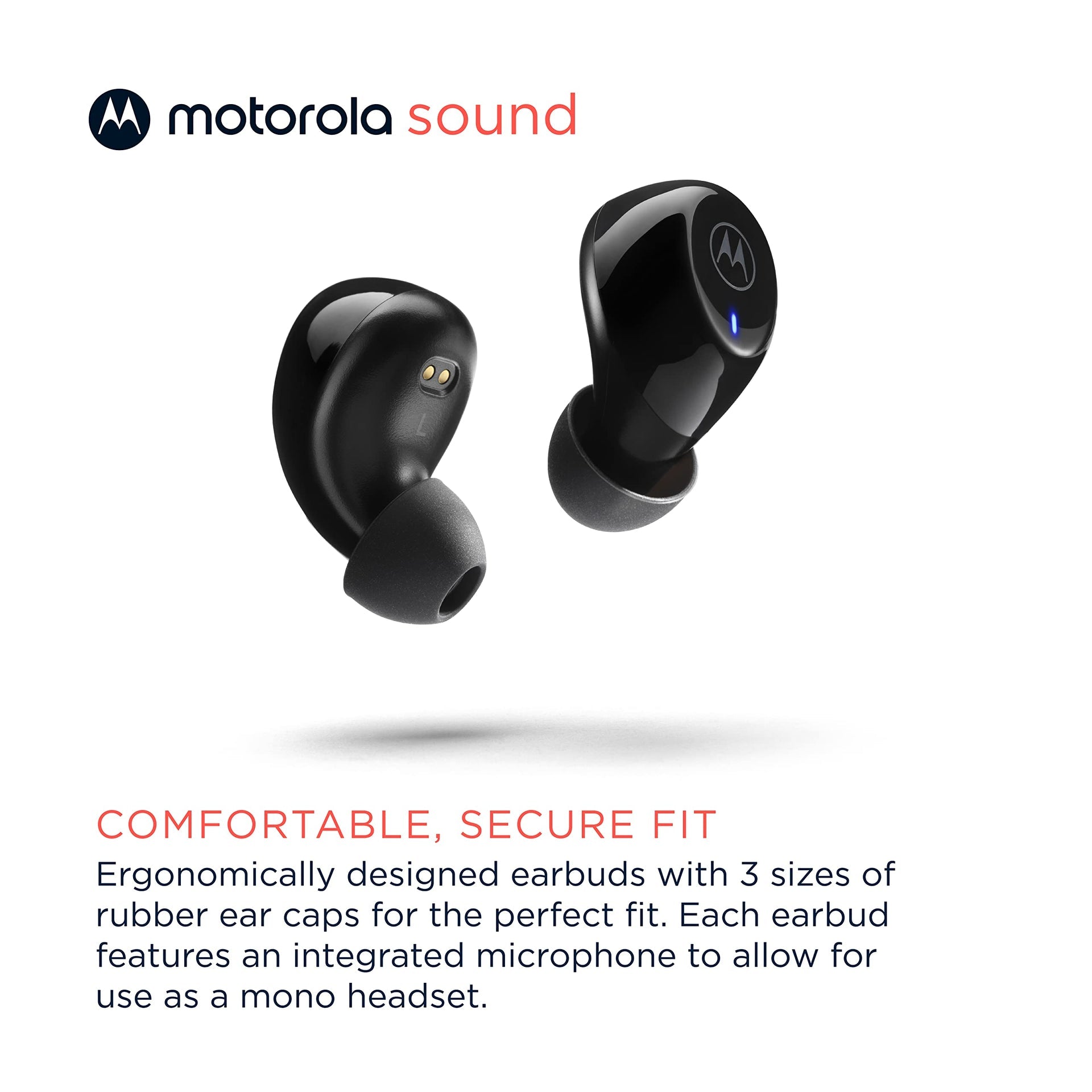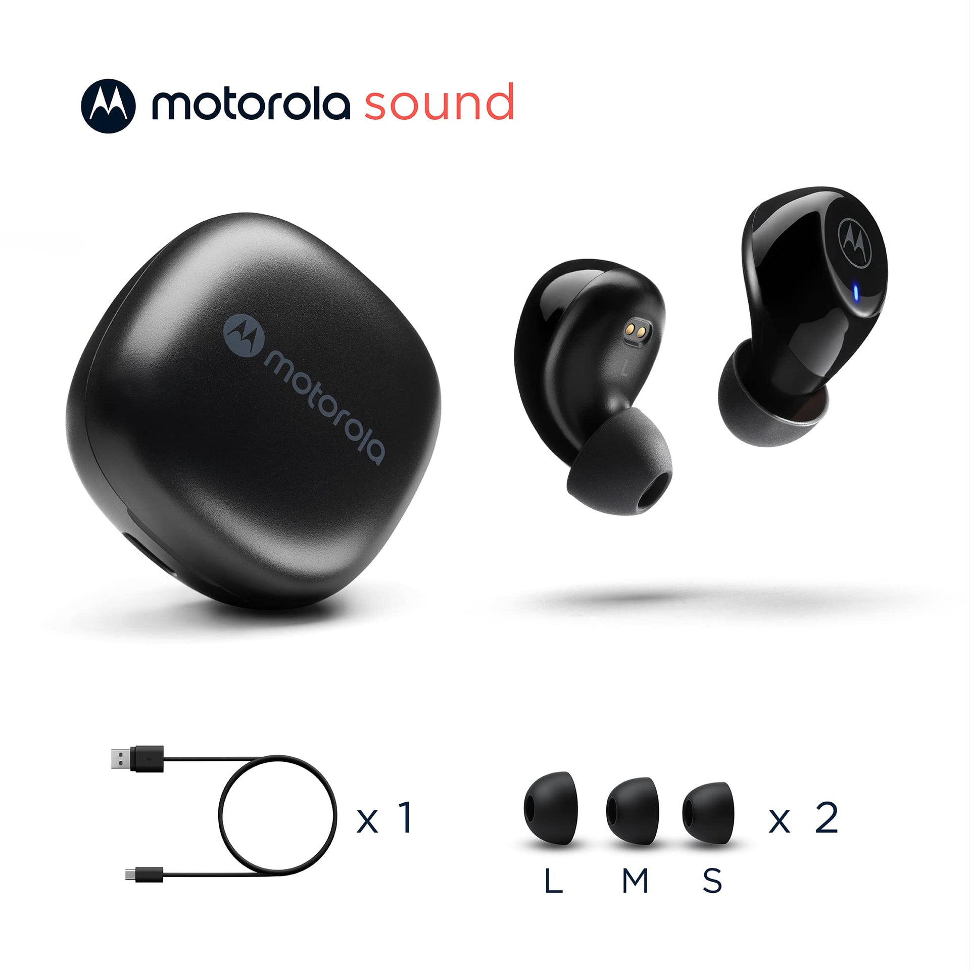 Audífonos Bluetooth Motorola Sound Moto Buds 105 control táctil y funda de microcarga, IPX5, resistente al agua, ligero, ajuste cómodo, sonido claro, color negro