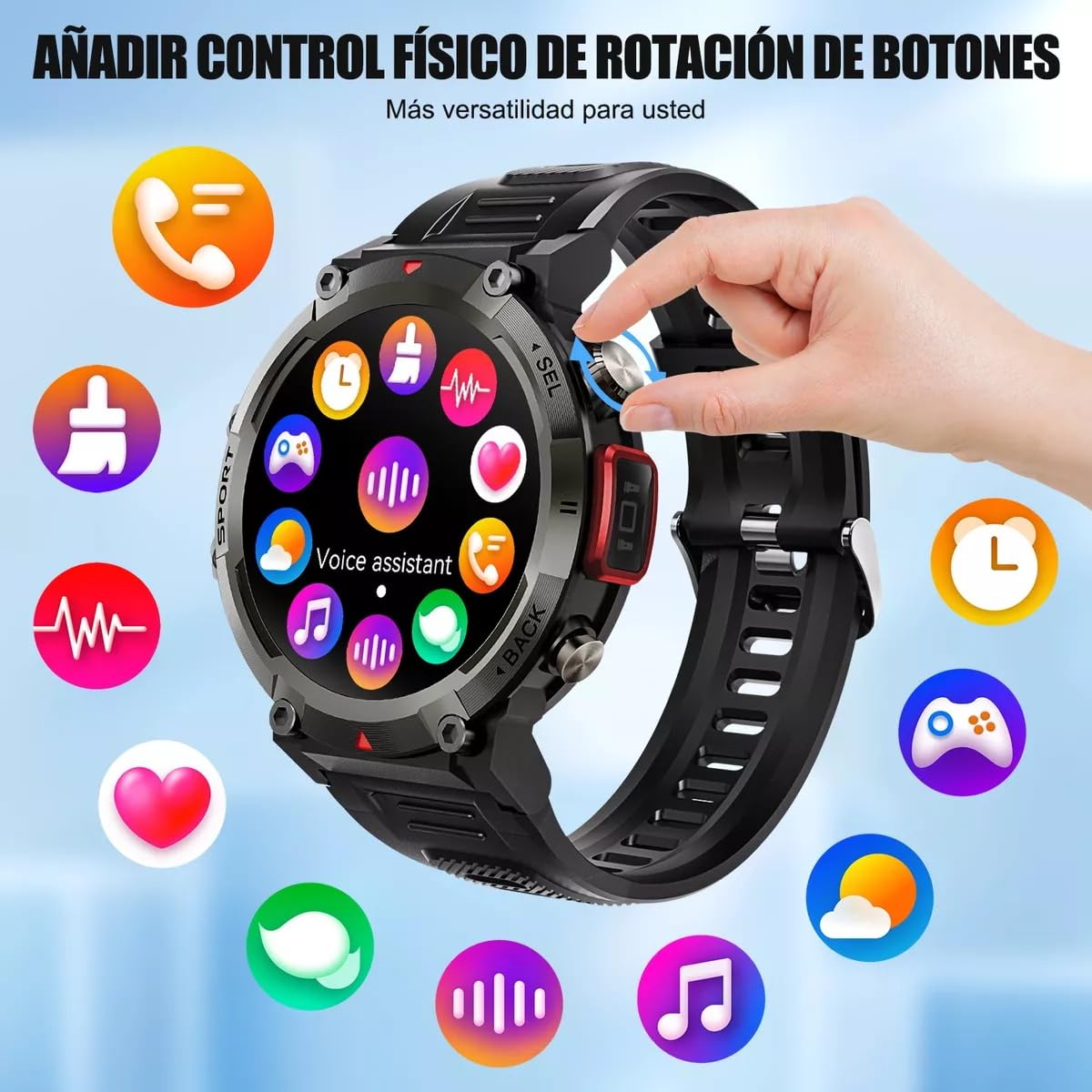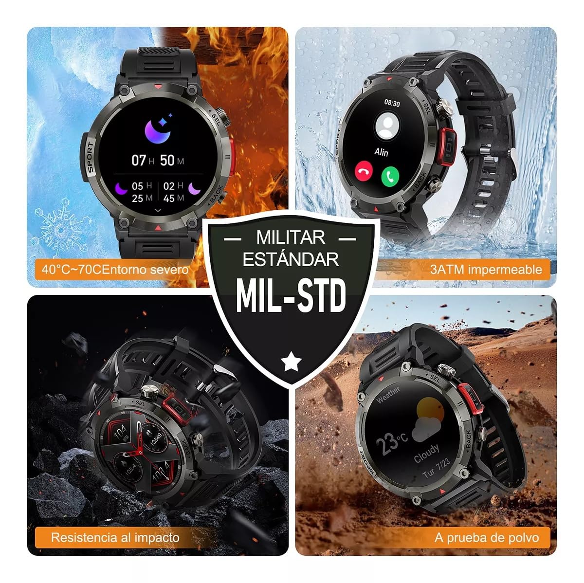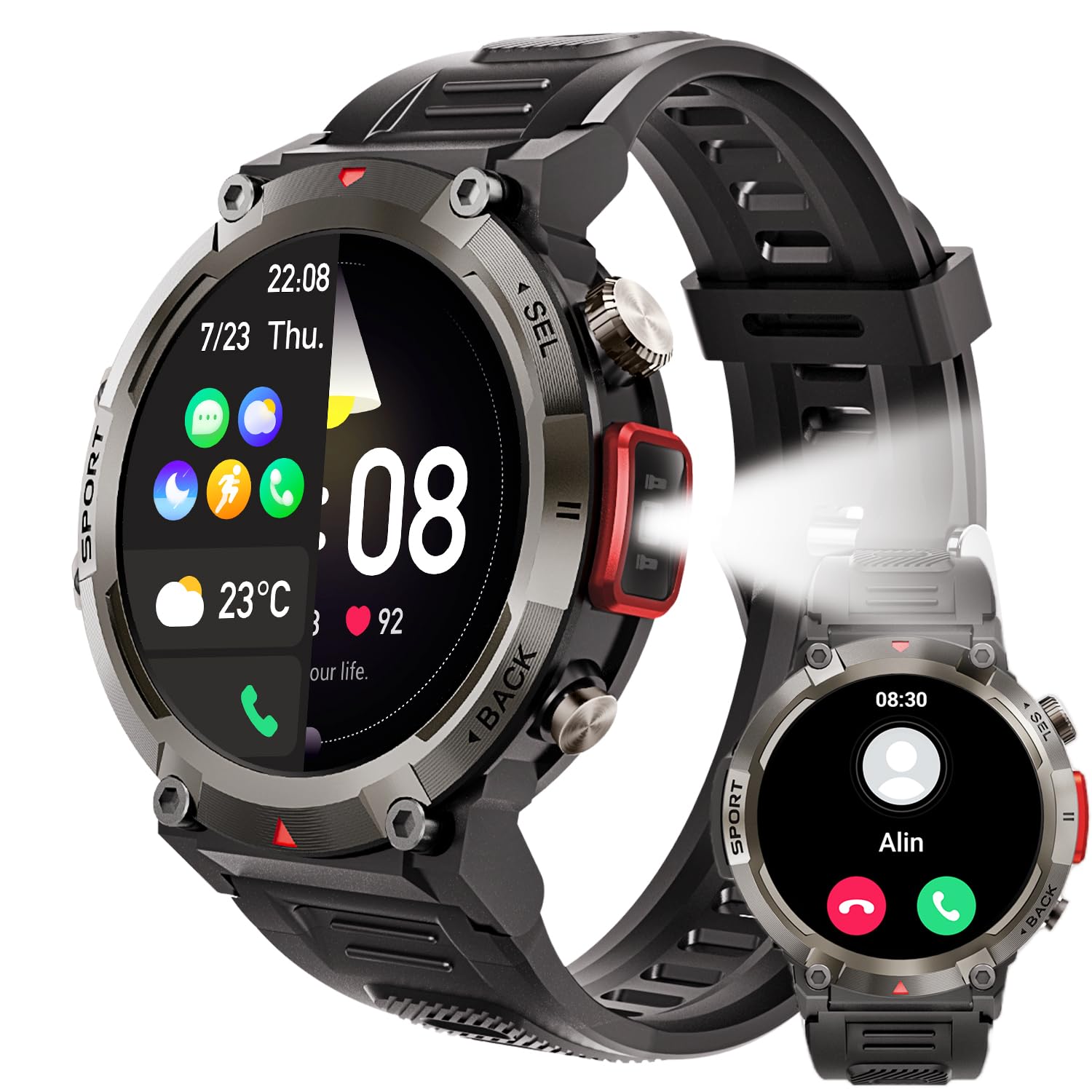 Reloj inteligente militar para hombres con linterna LED 1.45" resistente 3ATM impermeable Smartwatch con 100+ modos de deportes Fitness Tracker con monitor de ritmo cardíaco sueño para iOS Android
