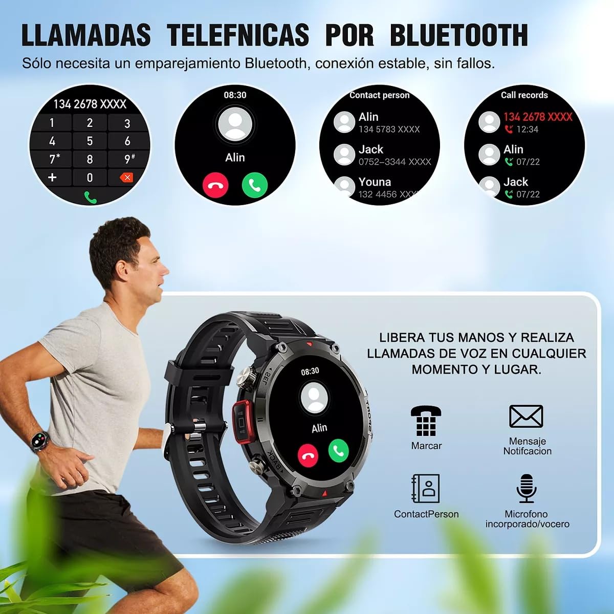 - 📞【Recordatorio de Llamadas y Mensajes por Bluetooth】: Este reloj inteligente para hombre admite llamadas por Bluetooth, puede responder y hacer llamadas sin un teléfono móvil. El reloj inteligente también es capaz de recibir mensajes, llamadas y notificaciones de otras aplicaciones (como WhatsApp, Facebook, etc.) en tiempo real, por lo que nunca te perderás ninguna noticia importante. Viene con una variedad de pequeñas funciones prácticas. Por ejemplo: linterna, calculadora, etc.