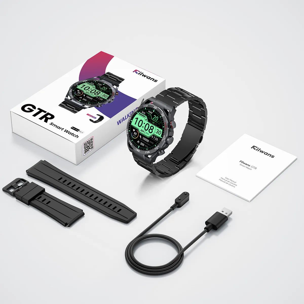 Incluye: 1 Smartwatch Filwans GTR, correa de silicón suave y cómoda, cable de carga magnético y manual de usuario.