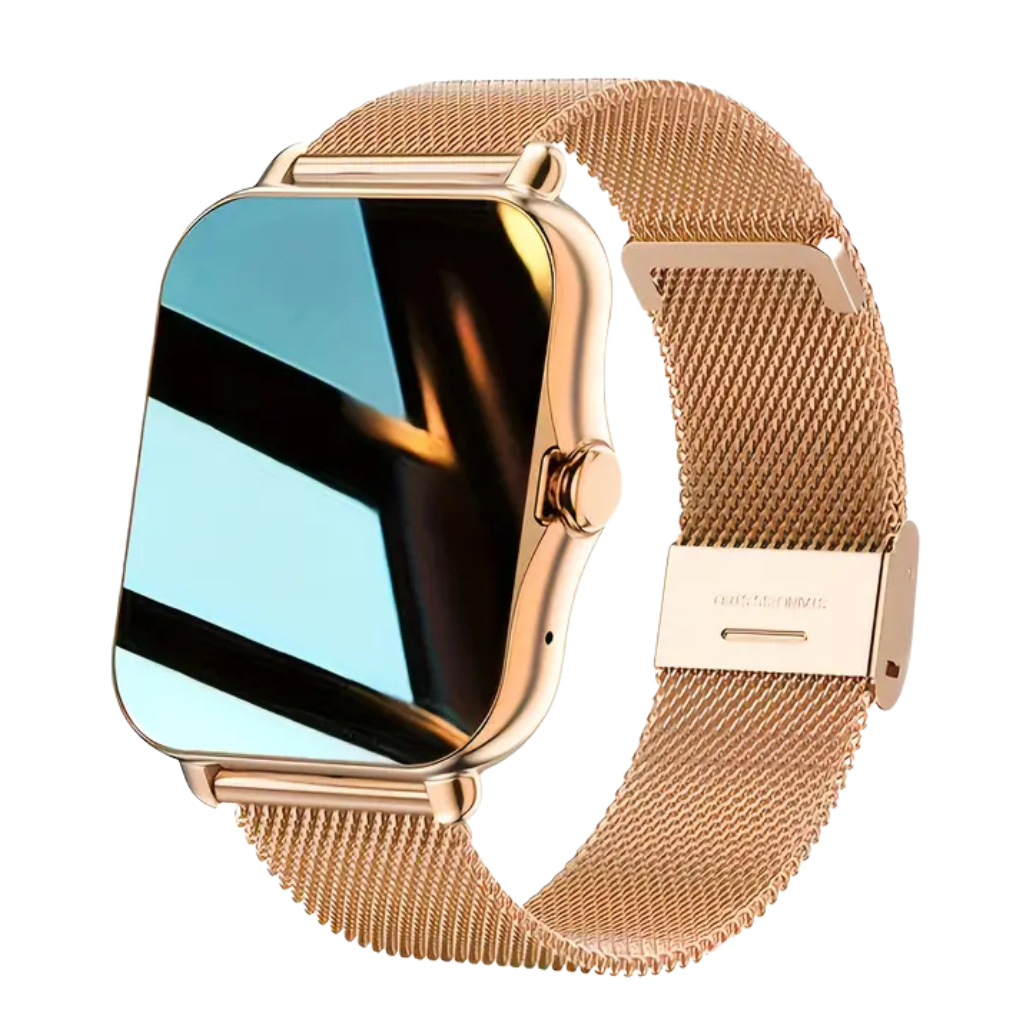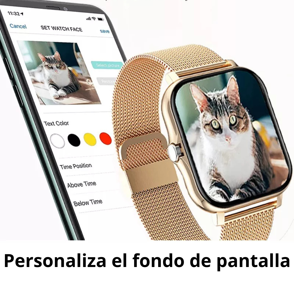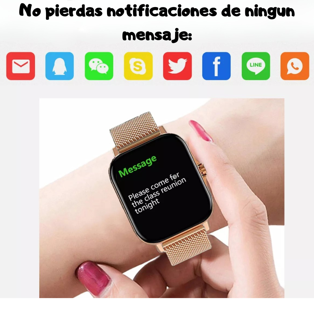 Este smartwatch dorado con correa metálica es más que un accesorio, es la combinación perfecta entre estilo y tecnología avanzada. Diseñado para mujeres que valoran la funcionalidad sin sacrificar el diseño, este reloj inteligente será tu mejor aliado en el día a día.