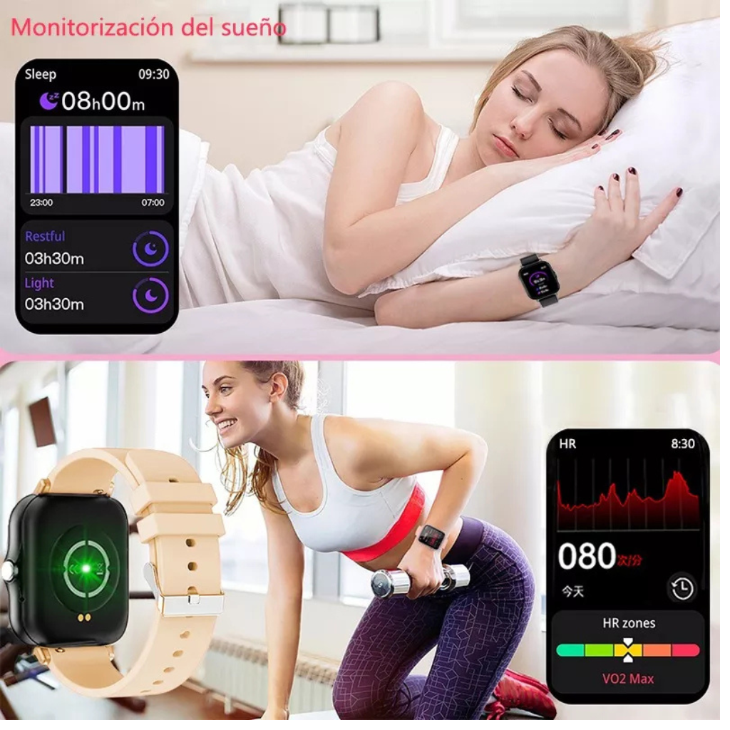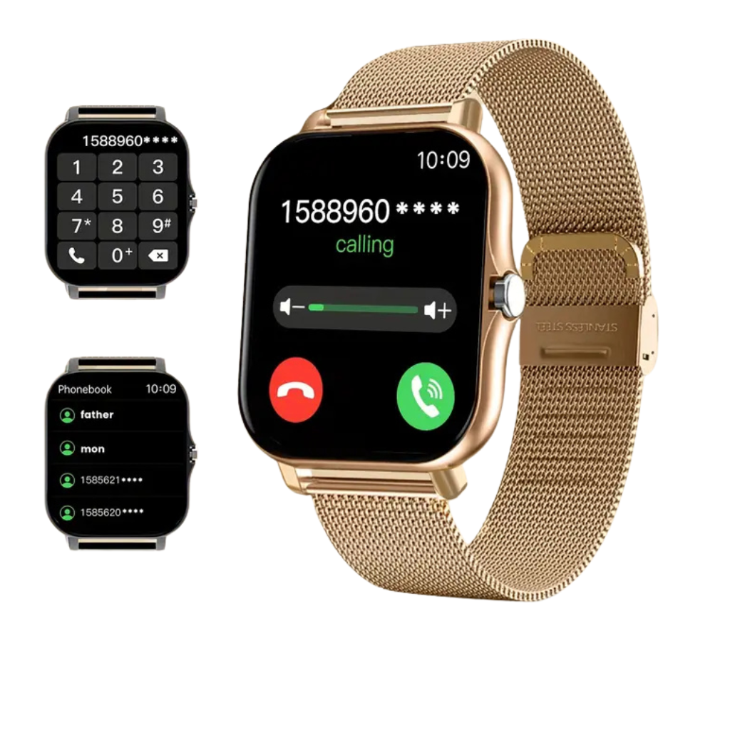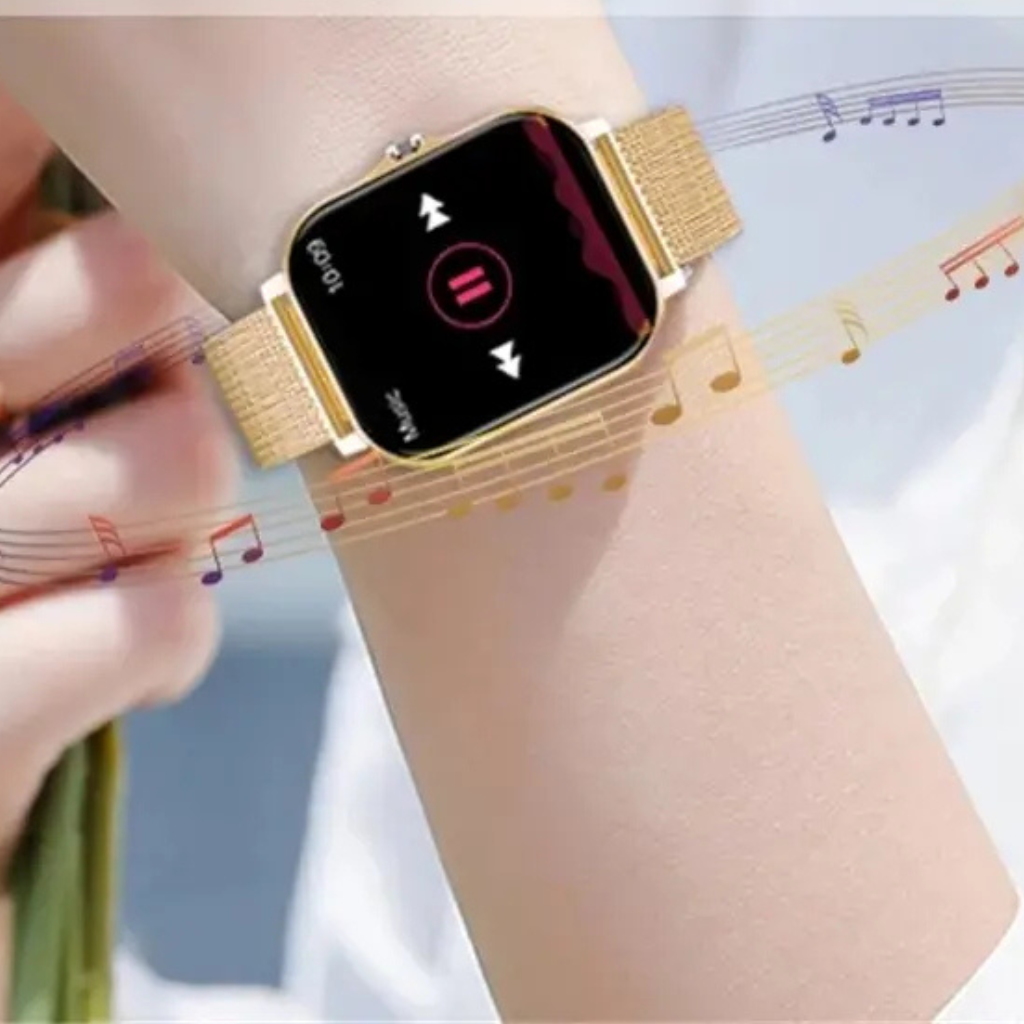 Este smartwatch dorado con correa metálica es más que un accesorio, es la combinación perfecta entre estilo y tecnología avanzada. Diseñado para mujeres que valoran la funcionalidad sin sacrificar el diseño, este reloj inteligente será tu mejor aliado en el día a día.